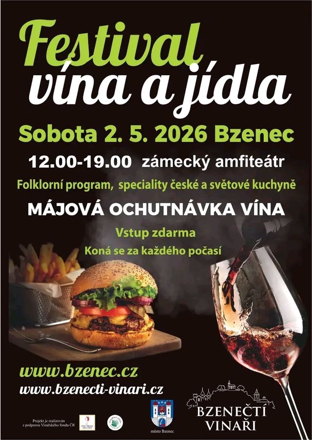 V sobotu 2. května 2026 se v Bzenci uskuteční Festival jídla a májová ochutnávka vína. Akce proběhne od 12:00 do 19:00 v zámeckém amfiteátru. Návštěvníci se mohou těšit na bohatý folklorní program a speciality české a světové kuchyně. Vstup na festival je zdarma a akce se koná za každého počasí. Srdečně zveme všechny milovníky vína a dobrého jídla.