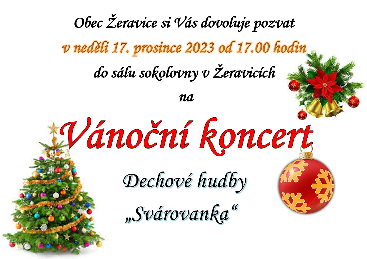 Obec Žeravice Vás zve na vánoční koncert, který se bude konat 17. prosince 2023 od 17 hodin v sále sokolovny v Žeravicích.