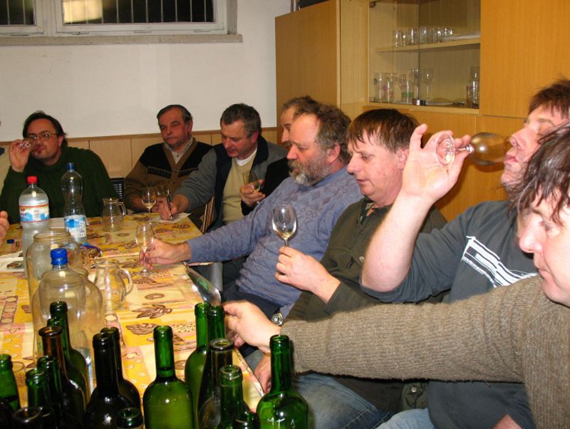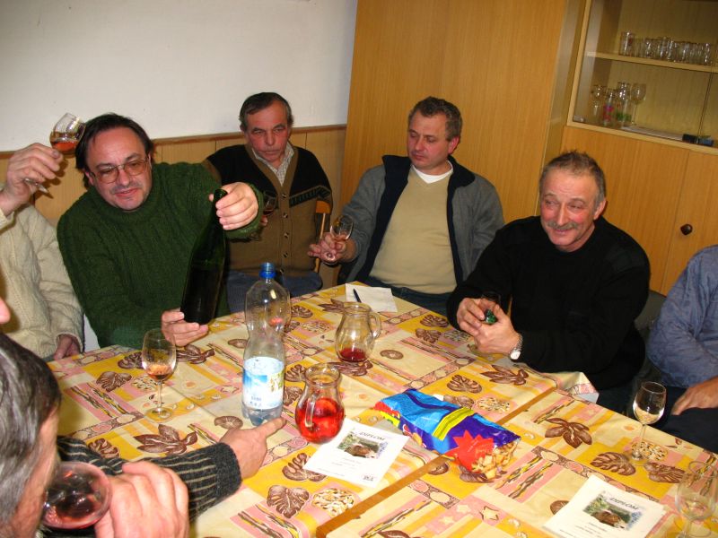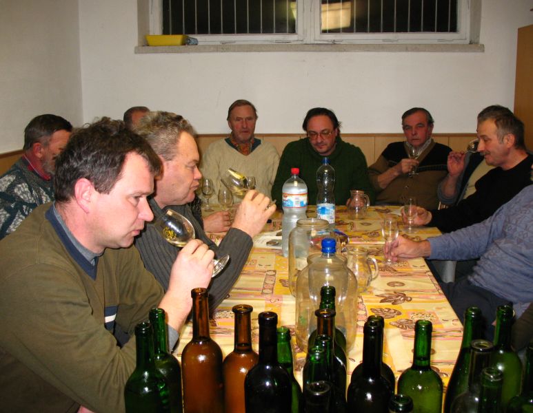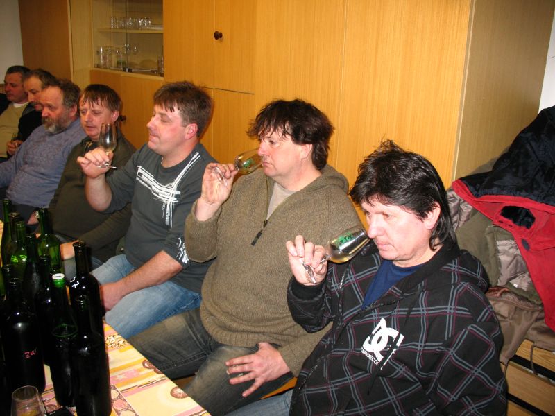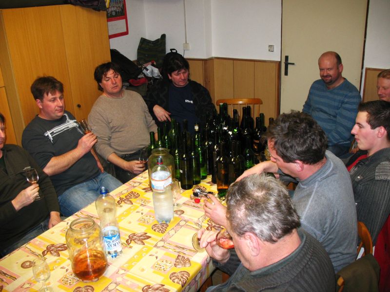 Na poslední ochutnávku přinesených vín na pálenici došlo se vzorky tolik místních (a jeden přespolní) vinařů, že čtvrt hodiny před začátkem byla klubovna zahrád-kářů narvaná k prasknutí – sešla se jich tu celá dvacítka. Poslední ze série pěti ochutnávek, zaměřených na mladá vína, byla věnována vínům starším – bílým, červeným i rosé. Celkem vinaři donesli 43 vzorků – z toho 23 bílých – nejstarším vínem byl ročník 1998 – nejvzdálenějším byl Merlot od protinožců z Austrálie, do-daný jediným naším profi degustátorem.